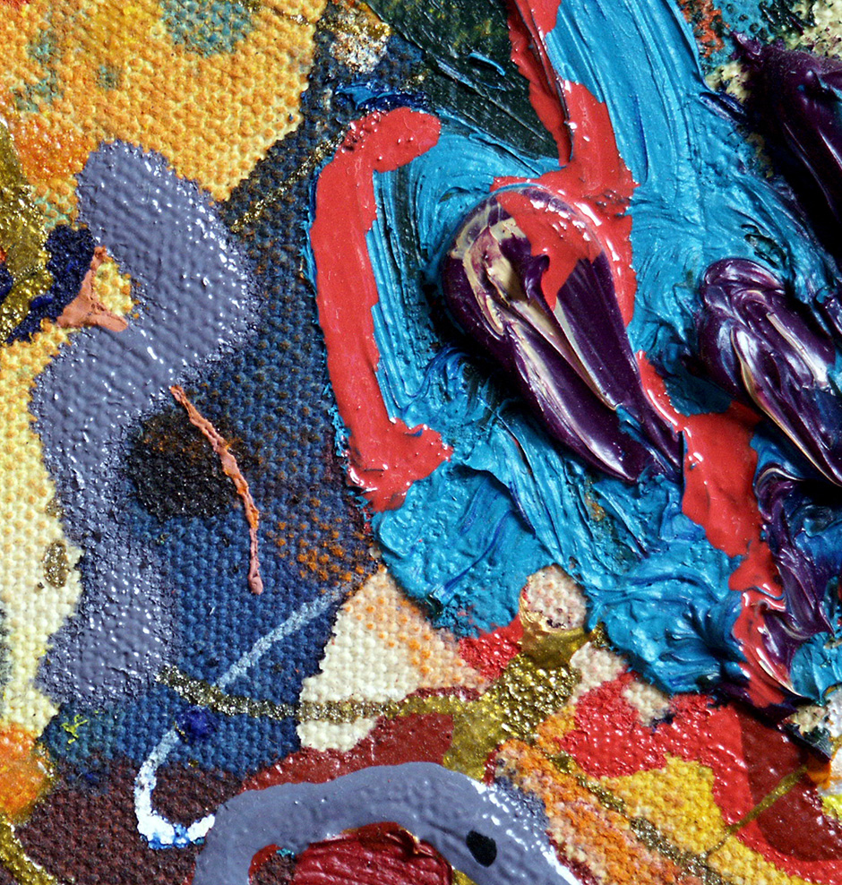 There can be a lot of details, symbols and layers in the painting - principal thrust in ‘Moments’ is me tracing a personal picturing of the glory, mystery and majesty of organic structures, developing and becoming molecules, acids, syrups and general sticky stuff - teeming, heaving and connecting in cascades of succulent chance. Movements which dictate the physical, metabolic and atomic nature of our flesh and emotions. Once this this parcel of complexities have come together they must then grow and search for a purpose.