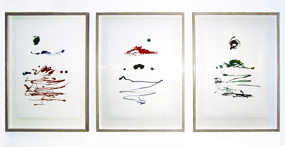 While staying on the side of a mountain overlooking the sea in southern Spain, I experienced a night of natural violence – a massive electrical storm that went on for several hours and felt like the end of the world. As it dissipated it provoked a breathless swelling twitching quiescence – a kind of post orgasmic conciliation between sky and Sea. This was the focus of the prints seen here.